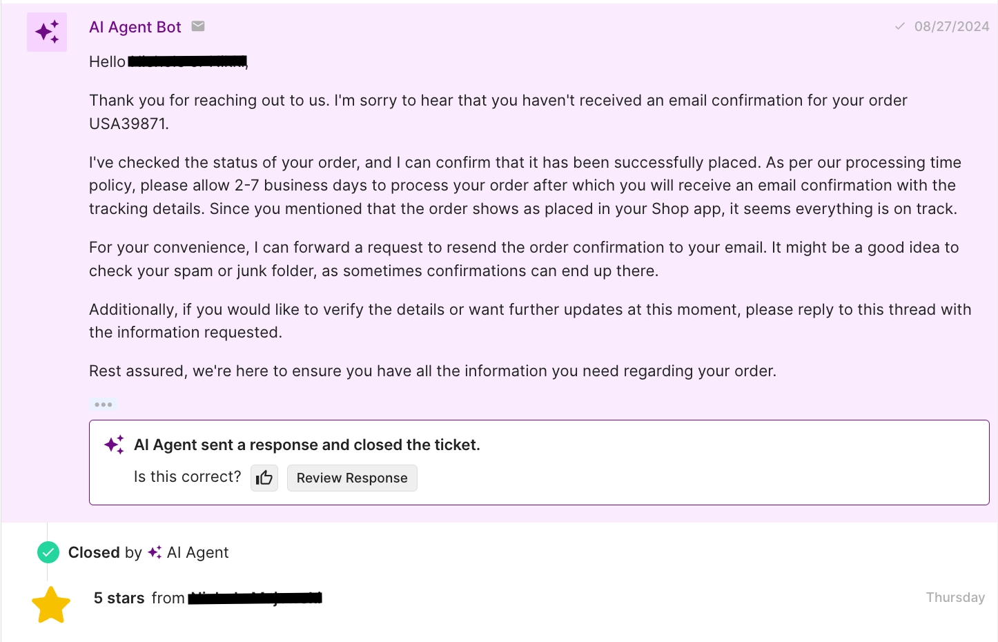 So far, AI Agent is great at handling common questions. For these kinds of FAQs, the human team would likely use a Macro. They don’t require a great degree of human touch. By using AI Agent, the team can provide customers answers much faster, and don’t have to spend time on simple, repetitive questions.