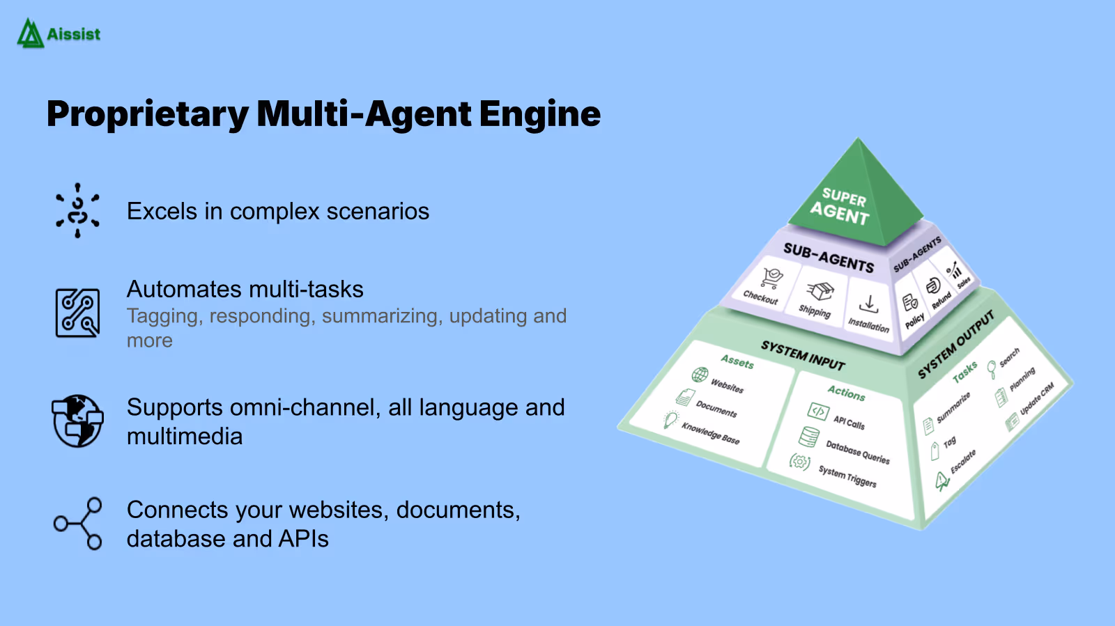 What sets Aissist.io apart is its Multi-Agent engine that excels in complex scenarios and multi-tasks across tagging, responding, summarizing, updating, and more. With flexible deployment into existing workflows and a cost-effective model, Aissist.io outperforms other solutions on every front.