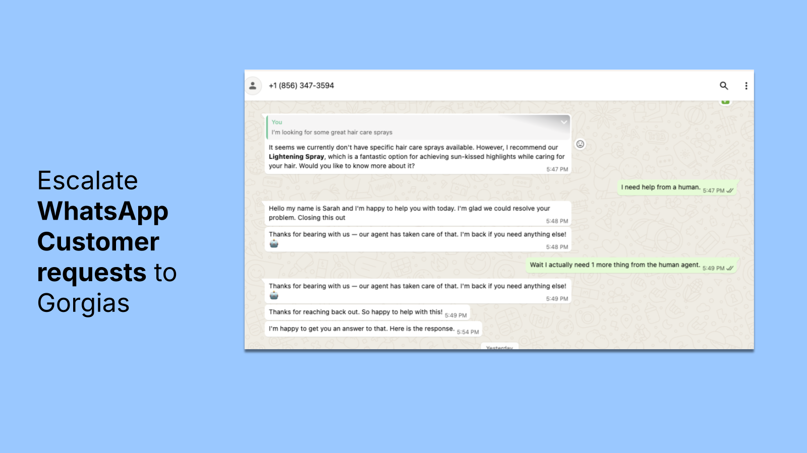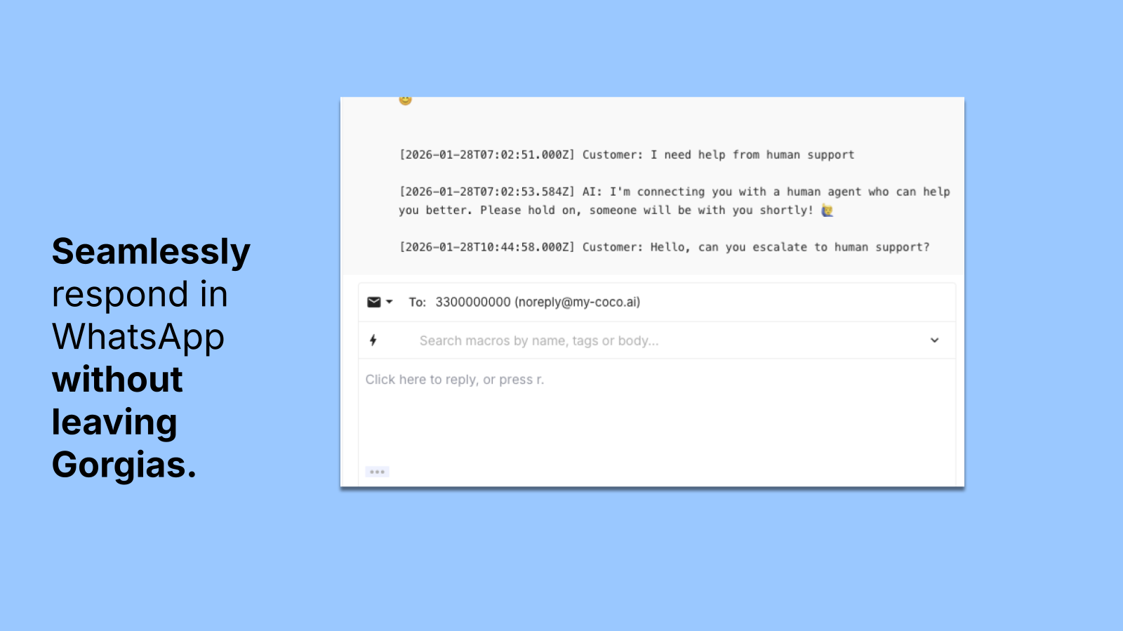 Completely manage the ticket from Gorgias but deliver the messages in a thread in WhatsApp so the customer never has to leave their text thread.