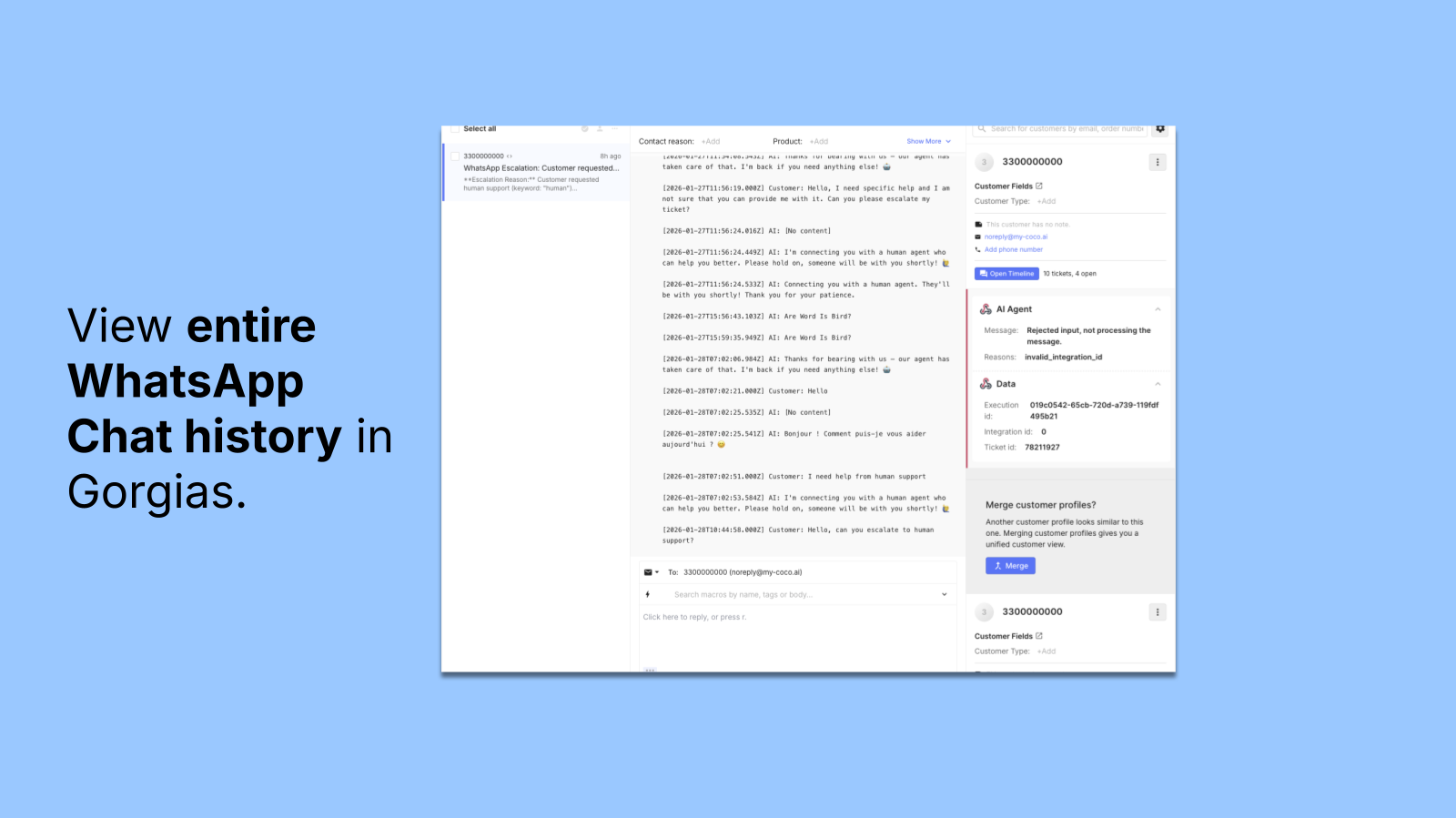 See the full conversation history with the customer when answering tickets in WhatsApp conversations.