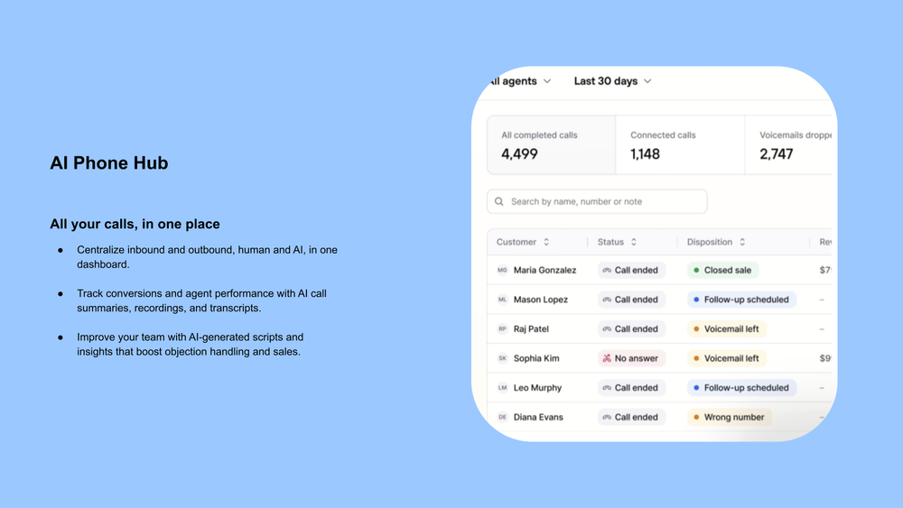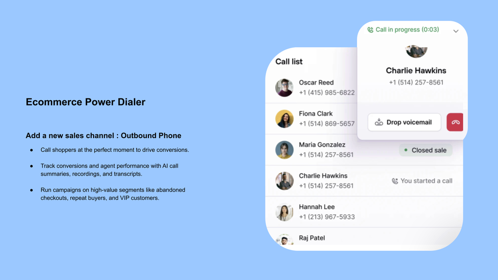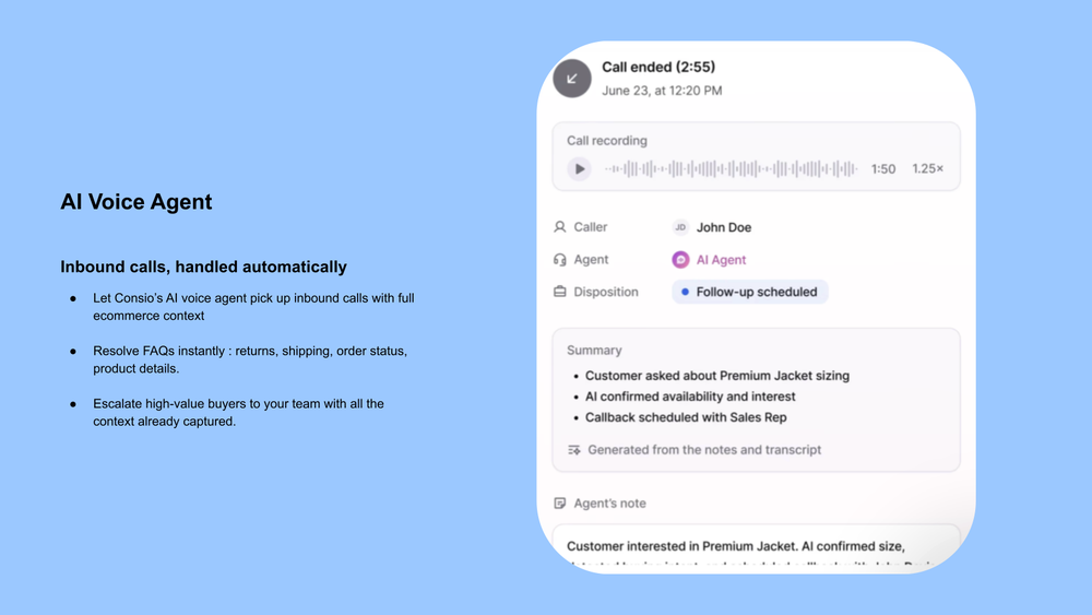 Consio transforms the telephone into an e-commerce revenue channel. The AI voice agent manages inbound calls 24/7, qualifies and escalates leads. For outbound calls, it launches targeted campaigns (abandoned carts, VIPs, high-value baskets) with power dialer + automated automated voicemail drop. The Phone Hub centralizes calls, summaries, and Shopify sales. Native Shopify, Klaviyo, and Gorgias integrations keep setup simple and track revenue from call to sale.