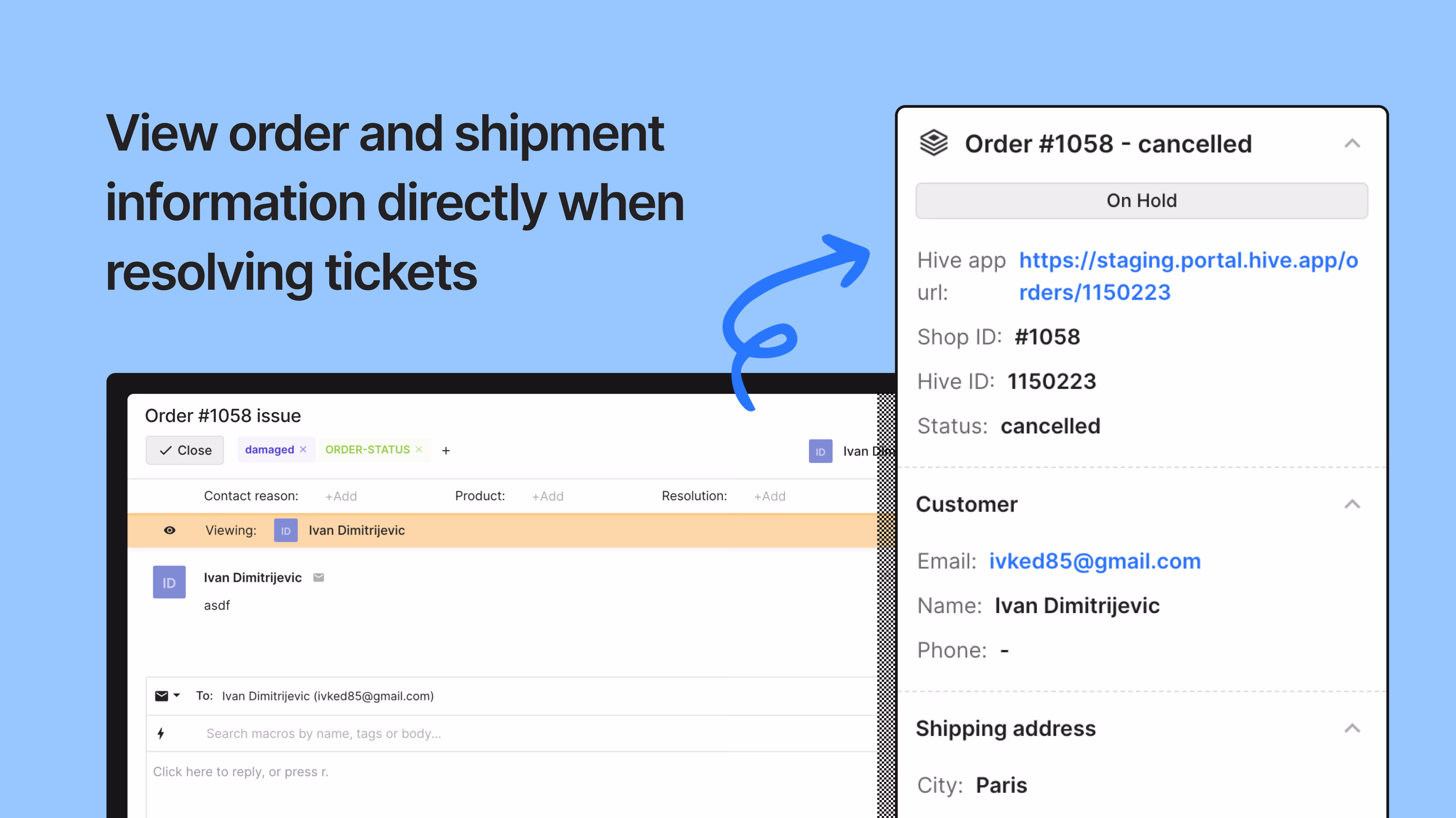 - Effortless order management: With just one click, access the ‘Order Details’ page in Hive through the integration’s deep link functionality, simplifying order management and reducing the time needed to resolve customer inquiries.
