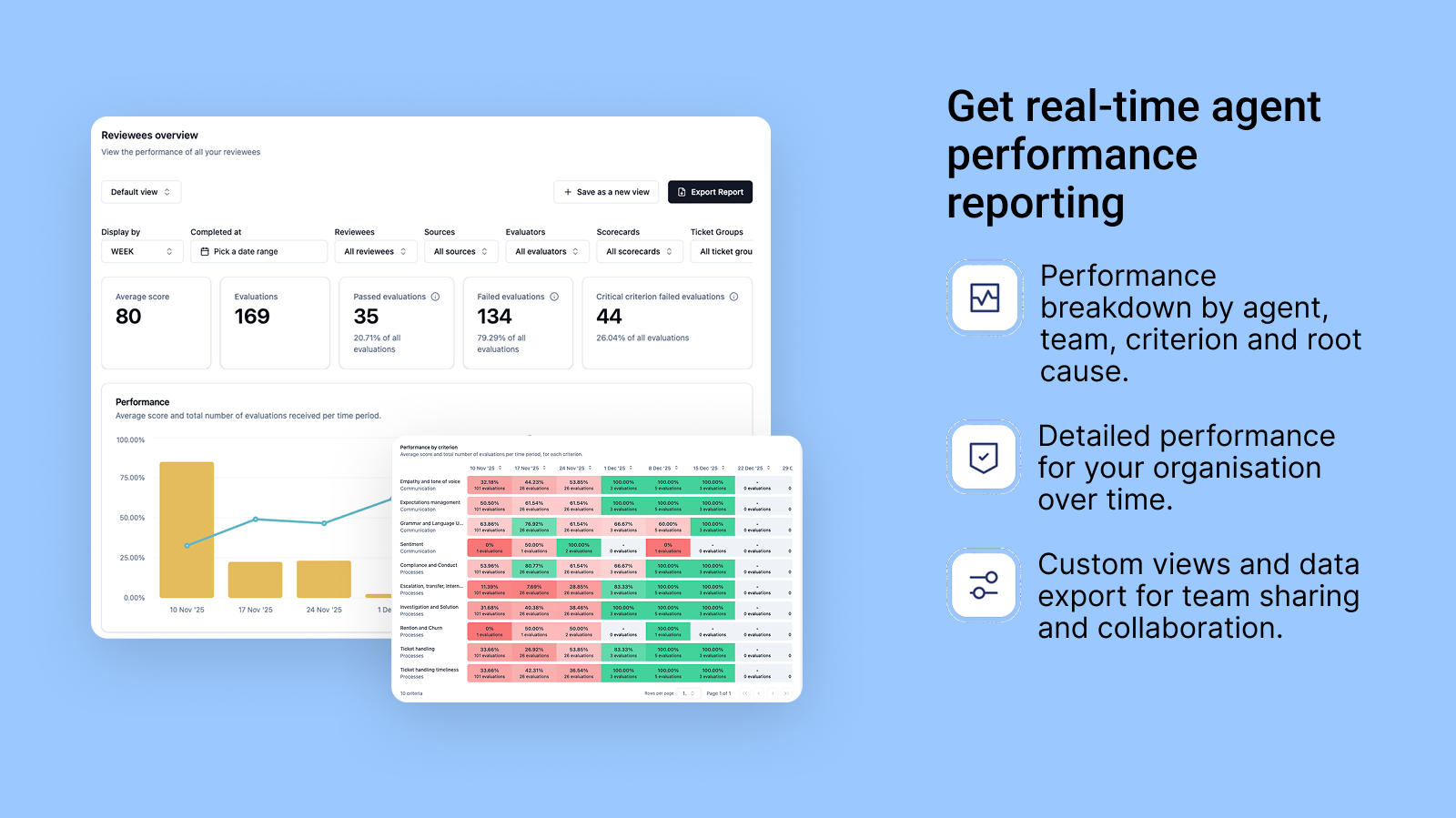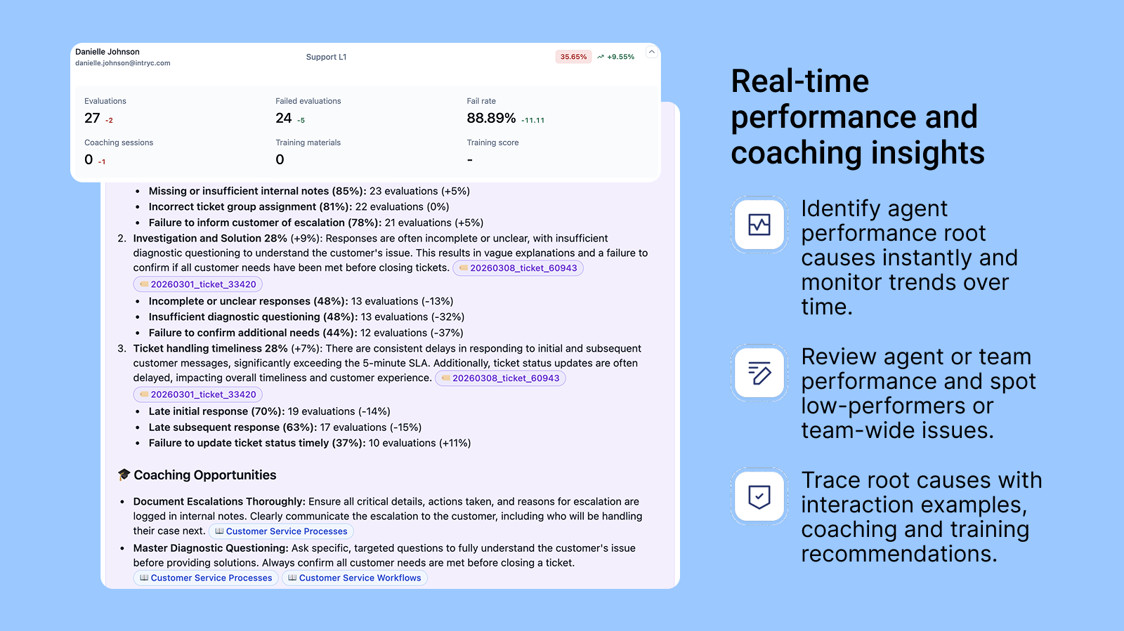 Spot underperforming agents and uncover knowledge or process gaps with real-time reporting and personalized insights.