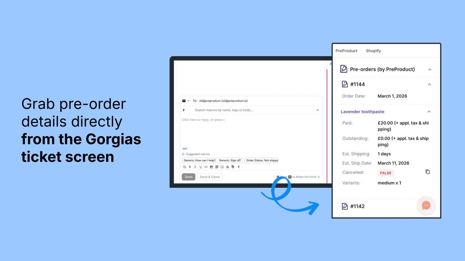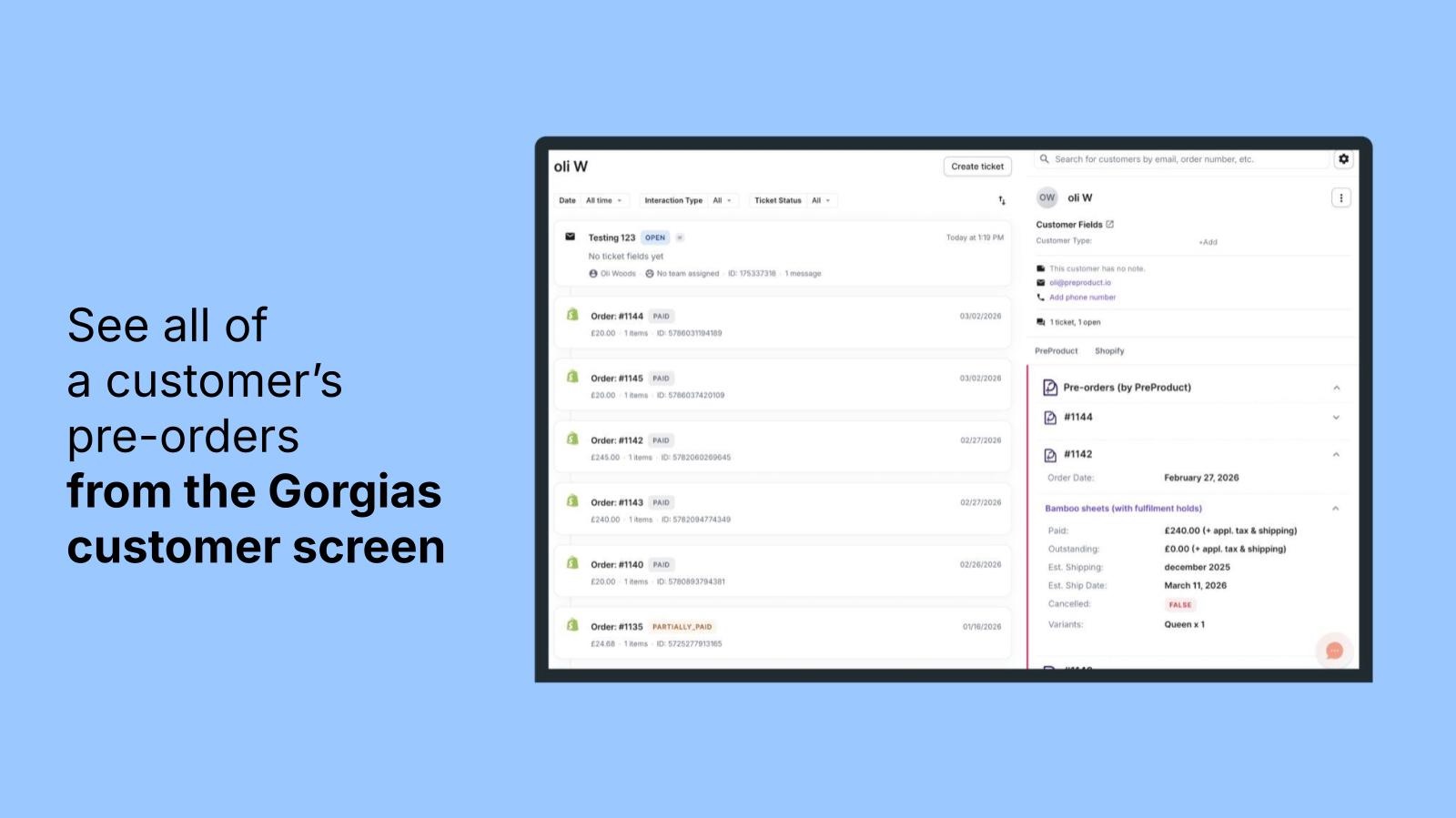 This means faster, more informed responses to pre-order inquiries. No more digging through your Shopify admin or PreProduct dashboard to answer questions like "When will my order ship?" or "How much have I been charged?", the information is right there in the ticket.