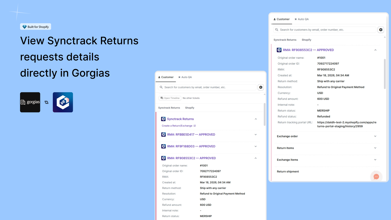 View all Synctrack return details in Gorgias, including RMA, order info, refund value, and status—helping support teams respond faster without switching apps.