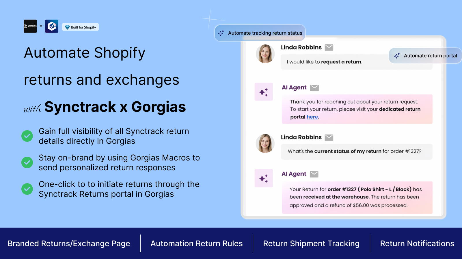 Stay on-brand with Gorgias Macros to send personalized, pre-made Synctrack responses while auto-tagging return tickets for easier tracking and management.