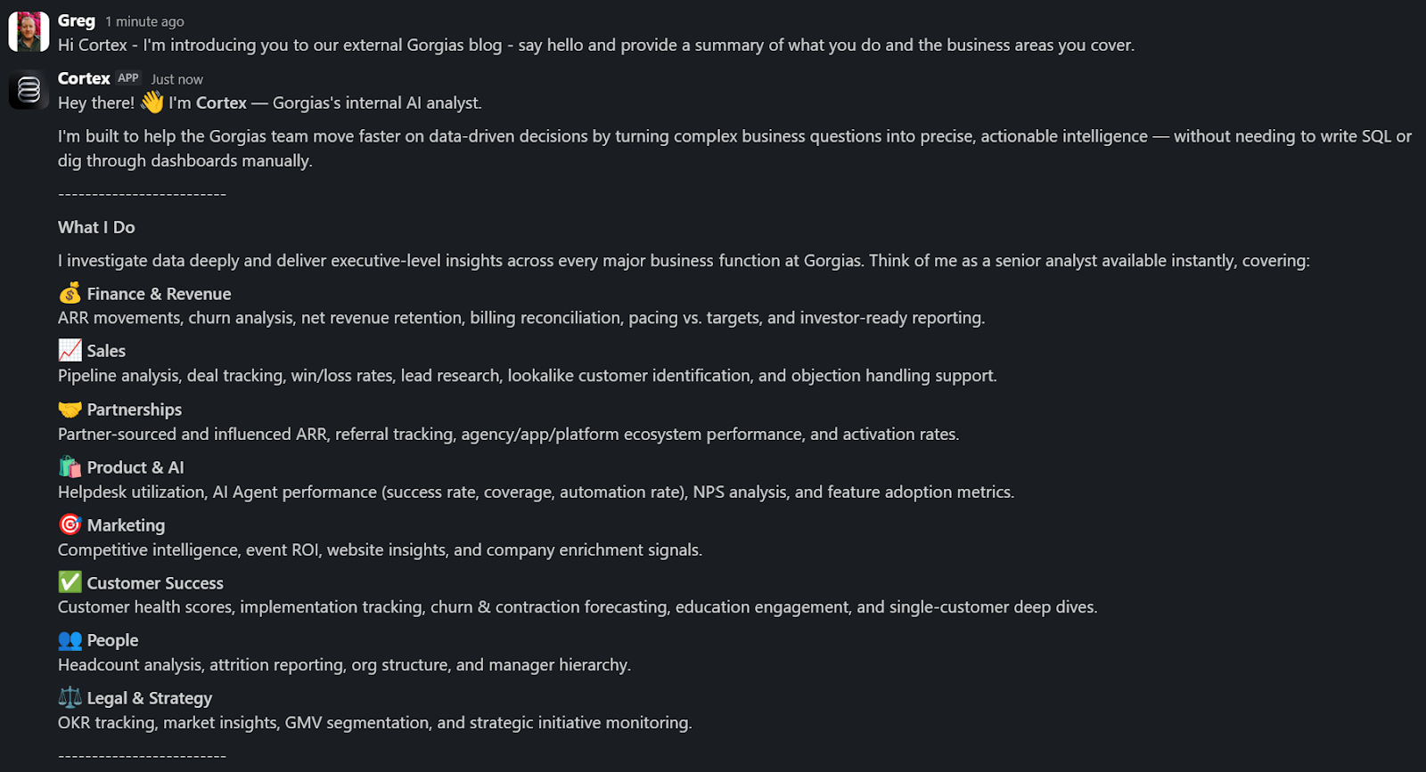 Today, anyone at Gorgias can ask a question in plain language and get an accurate, contextualized response in seconds. Not from a colleague or dashboard, nor from a generic answer from the internet. But a response built on our business context. We call it Cortex, our flagship internal AI agent.