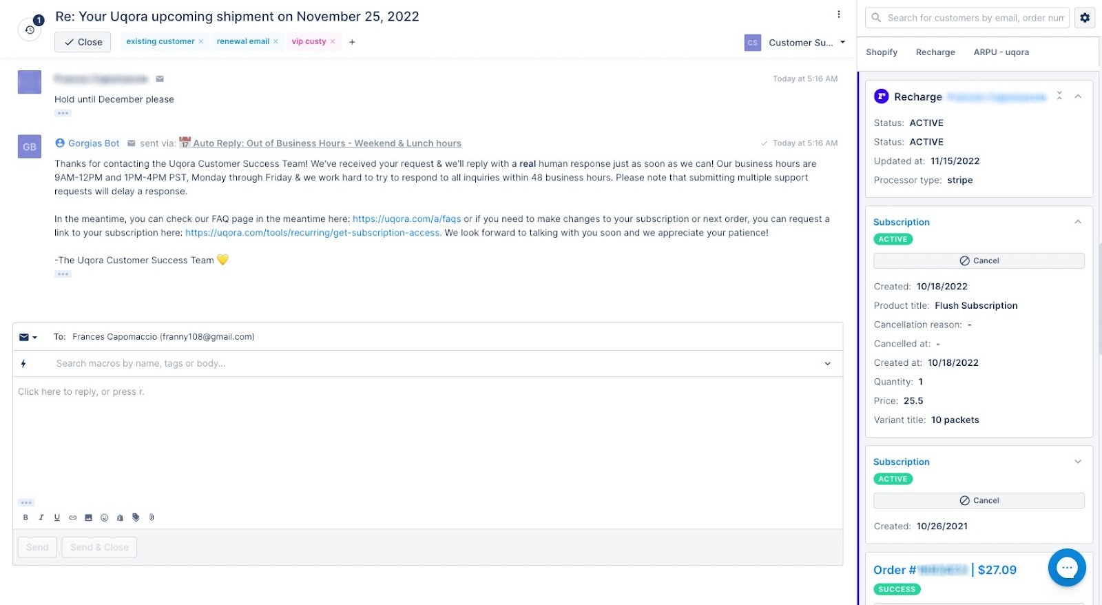 Solution: Uqora integrated Gorgias and Recharge so all customer information appears next to the customer conversation, no tab-switching necessary.
