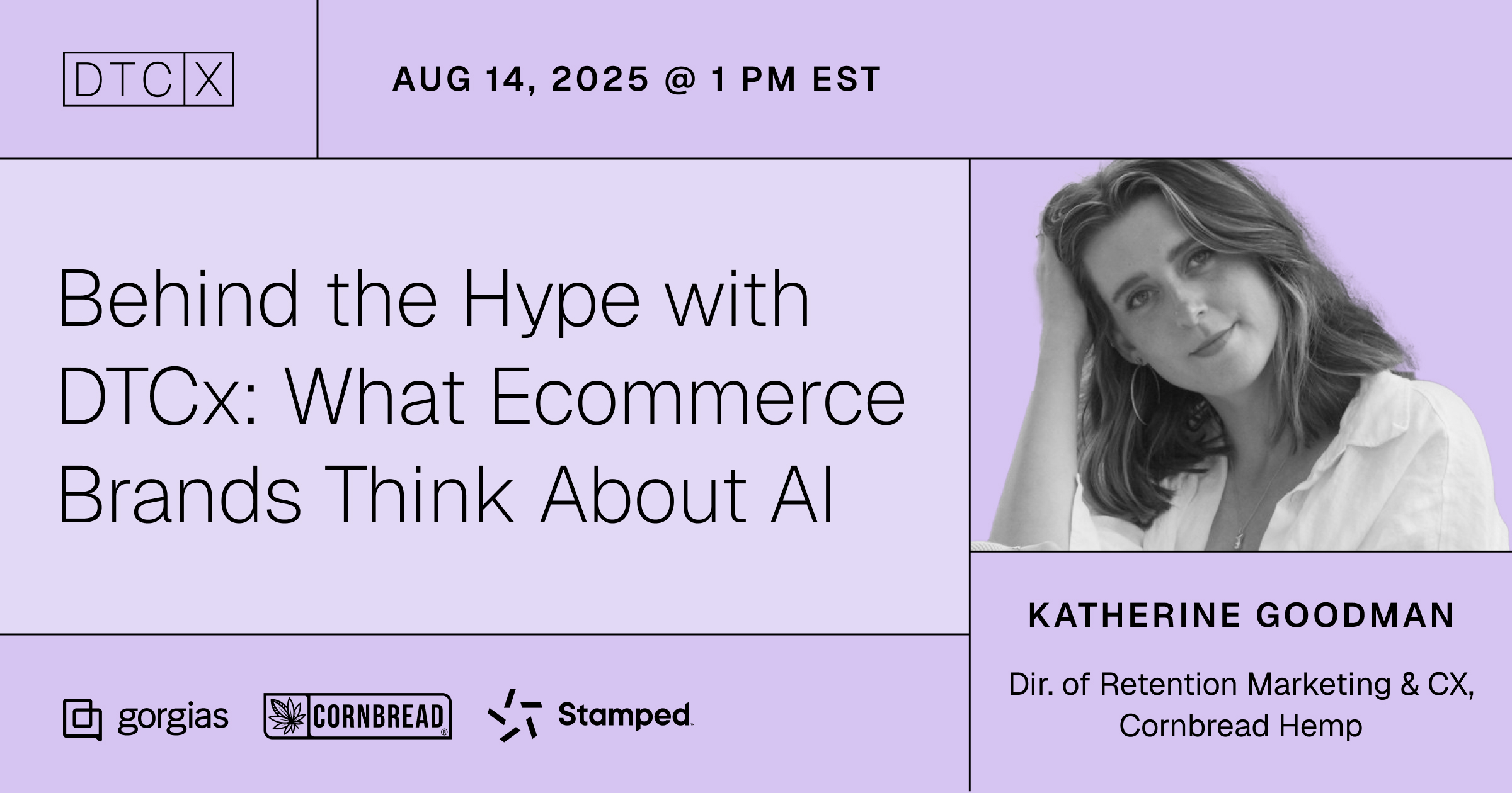 Join us LIVE on August 14 at 1PM EST for Behind the Hype with DTCx, featuring Katherine Goodman, Director of Retention Marketing & Customer Experience at Cornbread Hemp, alongside experts from Gorgias and Stamped.