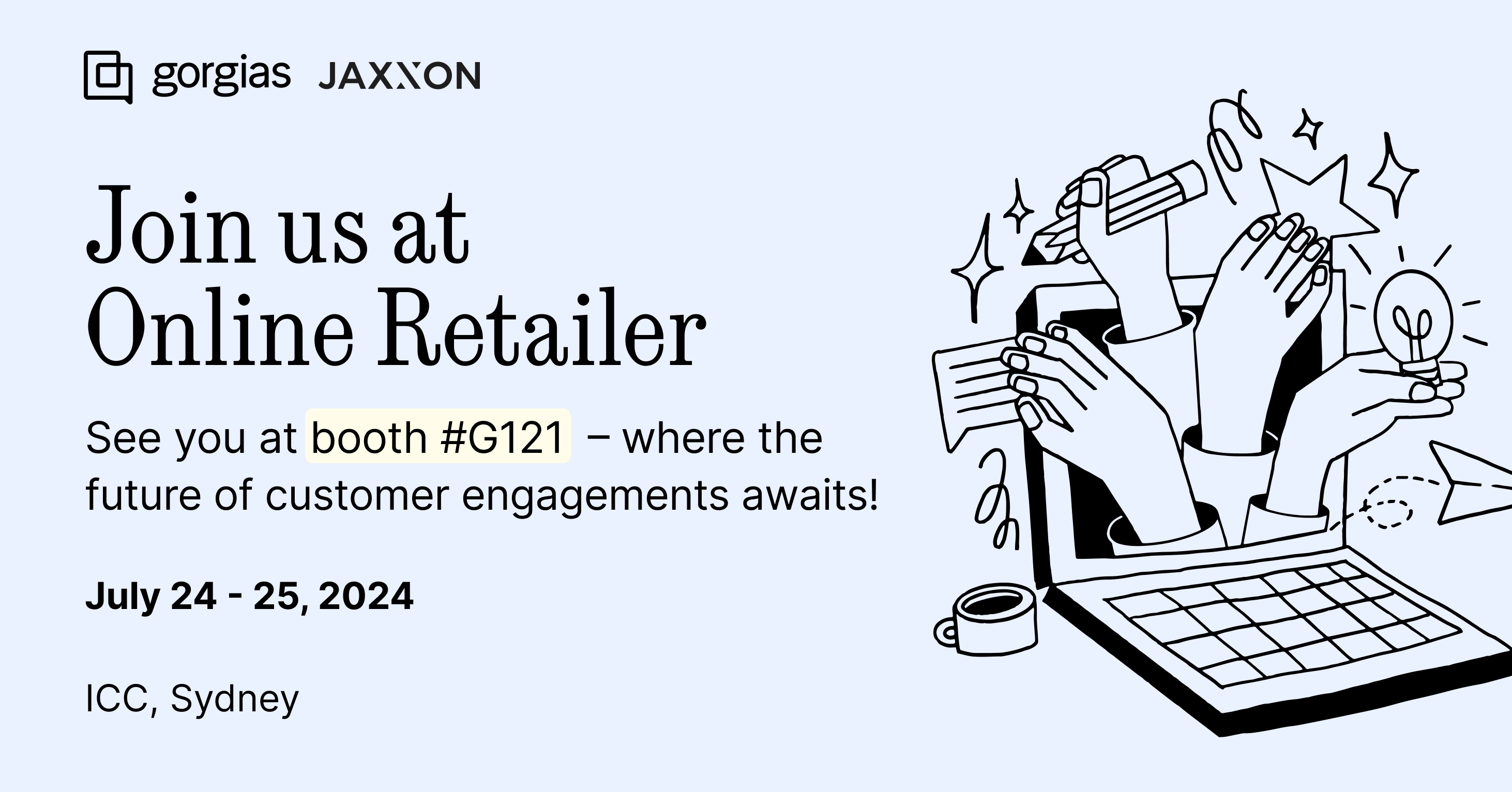 Gorgias is set to dazzle at Online Retailer, and we're taking it up a notch with an exclusive collaboration with JAXXON ! Our booth #G121 is transforming into a Jewelry Pop-Up Shop .Swing by, say hi to the Gorgias team and leave with a GORGIAS piece of JAXXON jewelry. - Because who says CX can't be stylish?But the excitement doesn't stop there!We will have our in-person Gorgias Helpdesk onsite for all things Gorgias and of course all the talk about our new AI AGENT ! When: July 24 - 25, 2024
