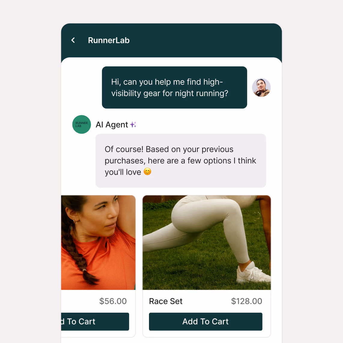Gorgias Shopping Assistant pulls from your product catalog to provide custom recommendations. Using real-time shopping behavior, it suggests products based on size, fit preference, and occasion, giving them confidence that they've found the right piece.
