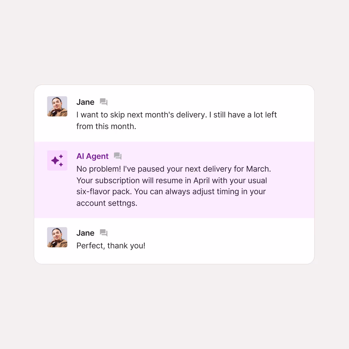 AI Agent lets subscribers keep up with their routines with automated pauses, skips, and swaps. You can even integrate with Recharge, Skio, or Loop, so subscribers are in full control, and your team can skip lengthy back-and-forths.