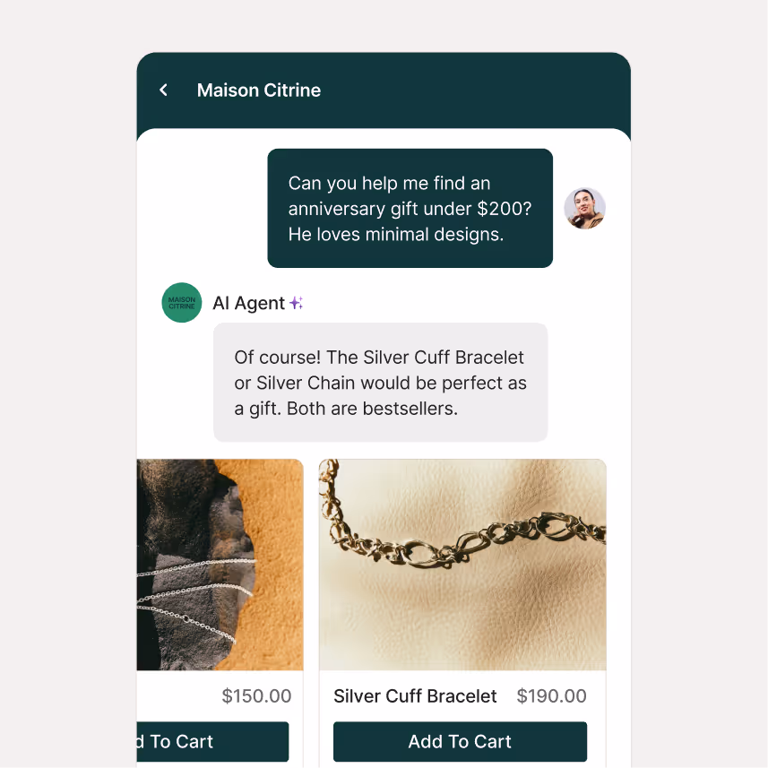 Count on Shopping Assistant to learn from each shopper’s behavior, recommending gifts, bundles, and upgrades that feel made for them. During peak seasons, customers get immediate assistance, while your team avoids burnout.