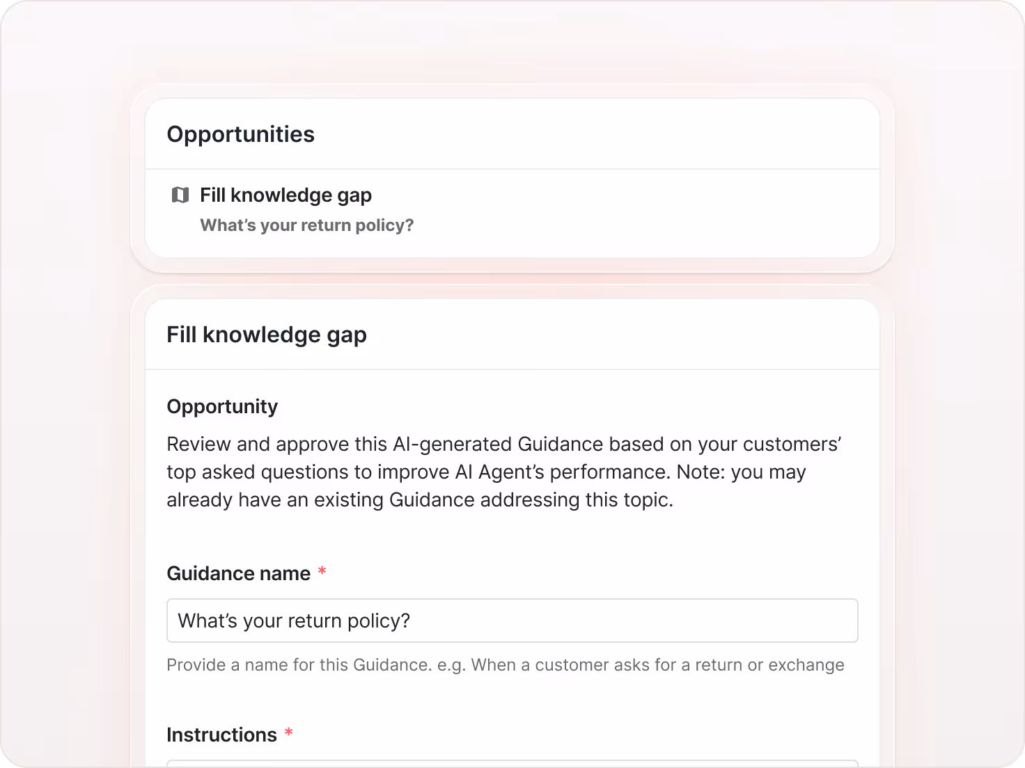 AI Agent now analyzes conversations and surfaces clear opportunities to resolve conflicting content or fill knowledge gaps. Stop guessing what to fix and focus on updates that improve conversations.