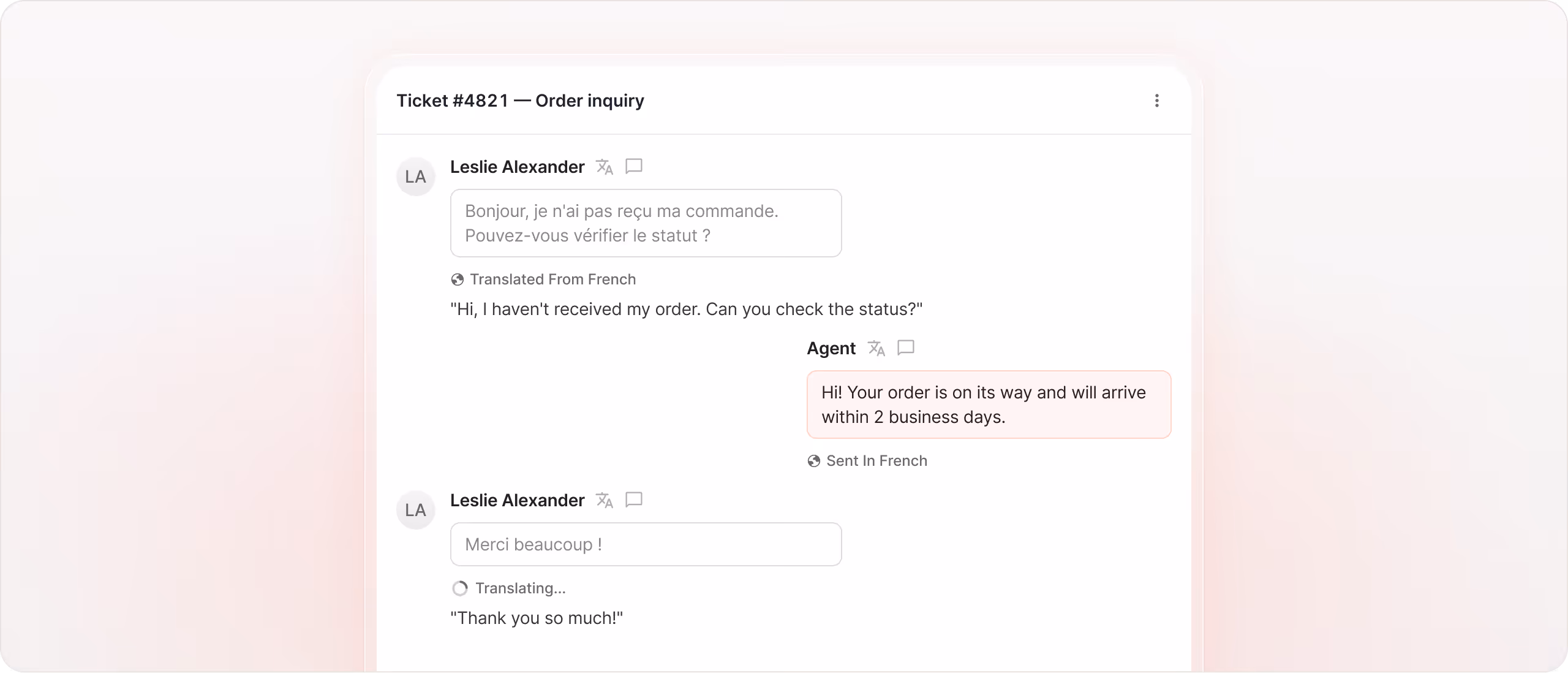 Translate inbound and outbound messages instantly inside the ticket. Preserve tone and intent while scaling support across regions without extra tools or workflows.